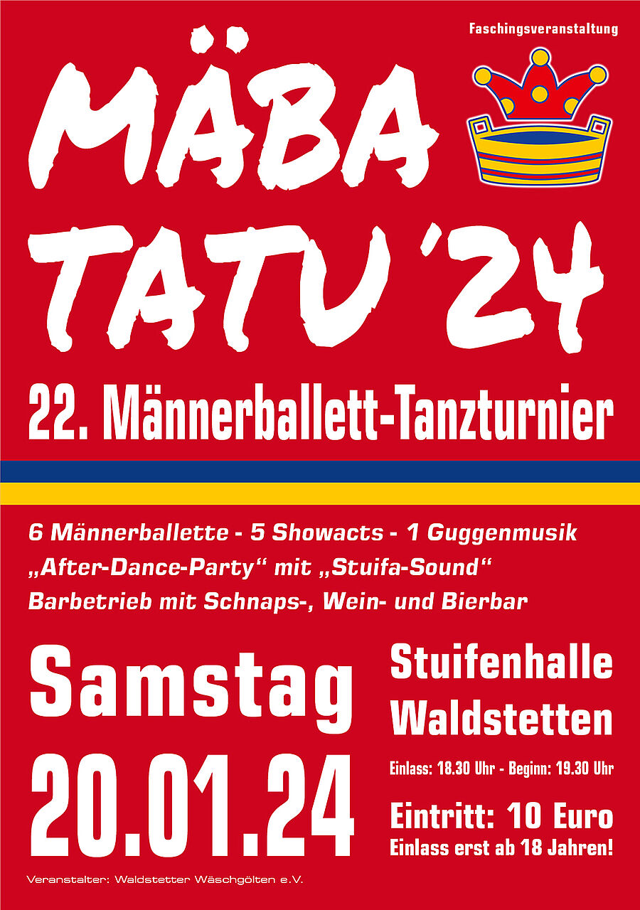 Das "MÄBATATU" feiert närrisches Jubiläum und so dürfen das Waldstetter Männerballett und die Waldstetter Wäschgölten für den kommenden Samstag, 20. Januar, zum 22. Männerballett-Tanzturnier in der Stuifenhalle in Waldstetten recht herzlich einladen.